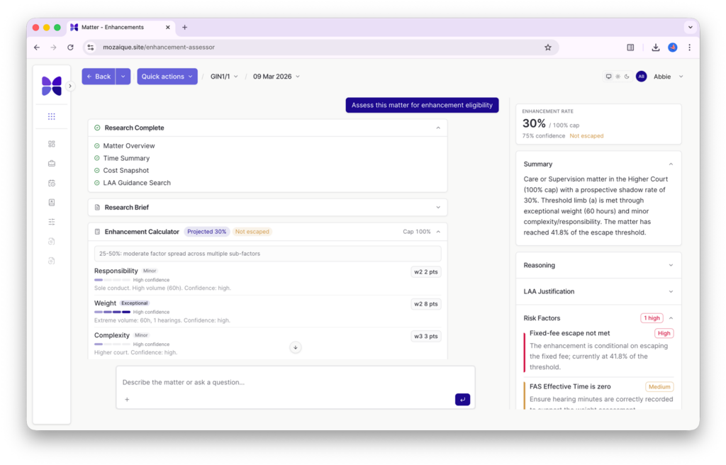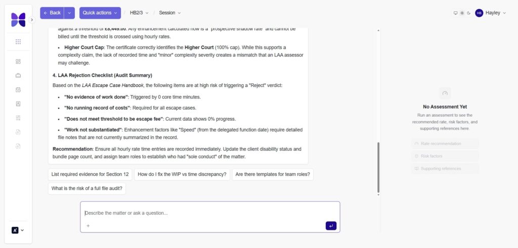 • Run a full assessment to check a matter against all relevant Legal Aid Agency rules, analyse documents and generate an enhancement recommendation.