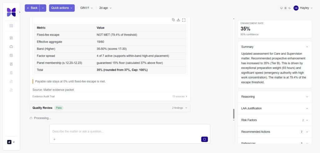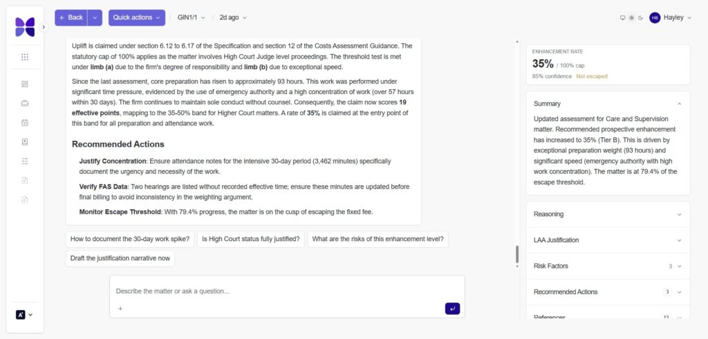 The AI Assessment Assistant provides a clear, estimated enhancement percentage, along with a plain-English summary of the outcome. It explains the reasoning behind the estimate, references the relevant LAA justification, highlights any compliance considerations, and recommends next actions to strengthen the matter and reduce risk.