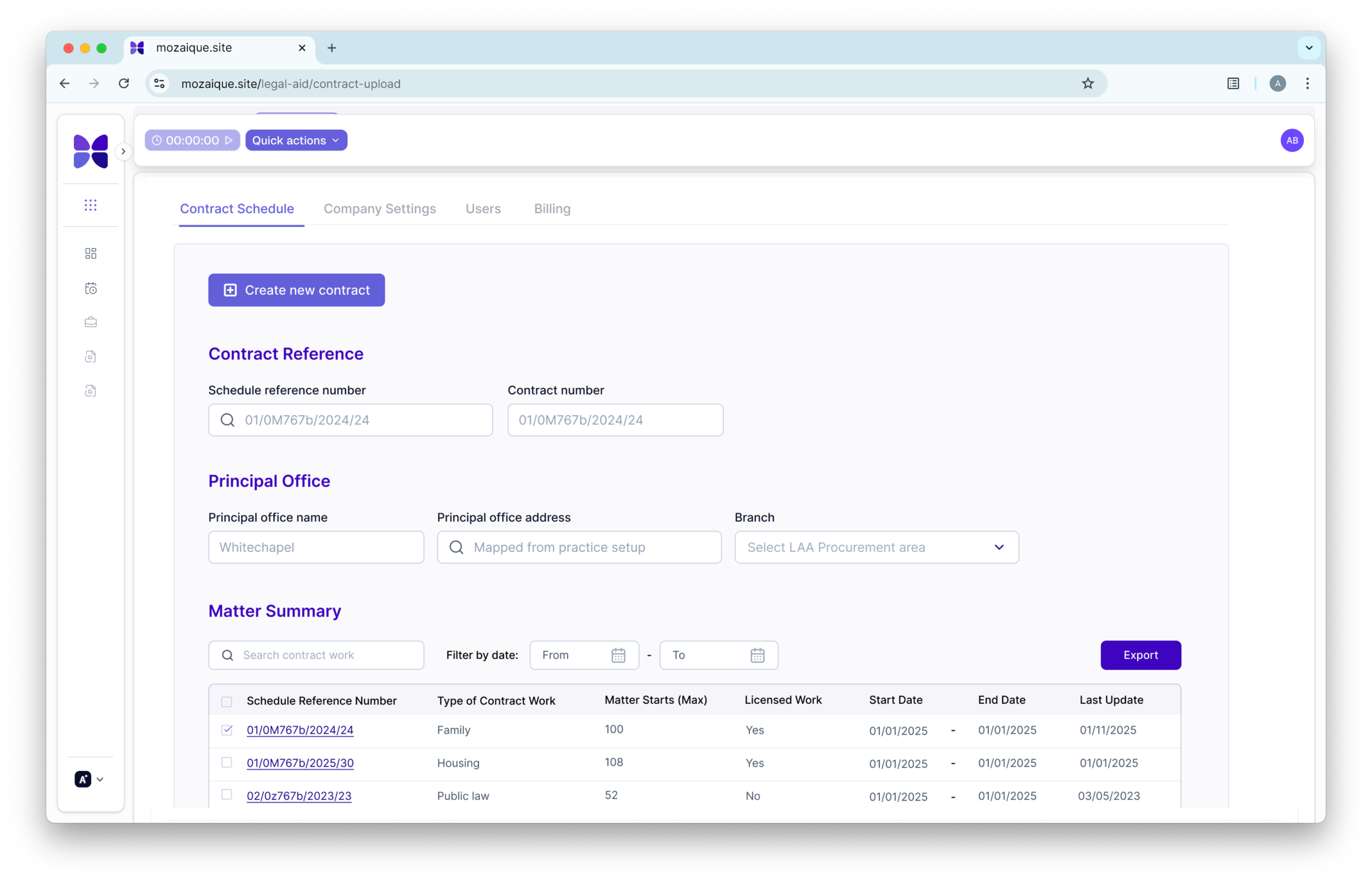 Adding in a certificate in most PCMS systems can be time consuming and complicated, especially if you have multiple contracts. In Legal Aid Manager, you can upload your PDF certificate and using our proprietary AI, we automatically extract the data from your certificate and do all of the hard work for you. Simply setup your branch, upload the contract and you’re ready to start creating cases, time recording & billing.